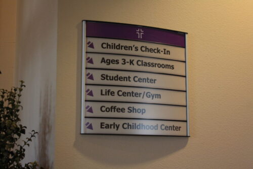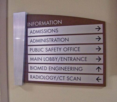 Our indoor directional signage includes: Wall, Door directional signs, Room Identification, dynamic mapping and interactive directional displays including a "virtual tour" of your building with digital way finding!